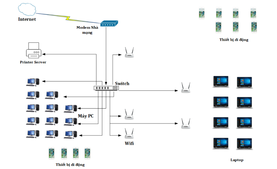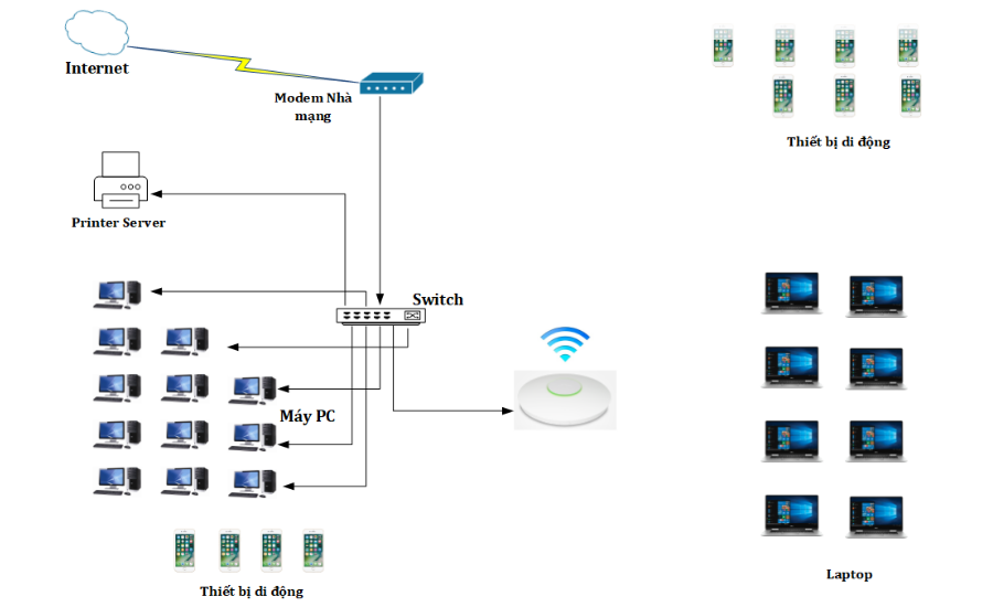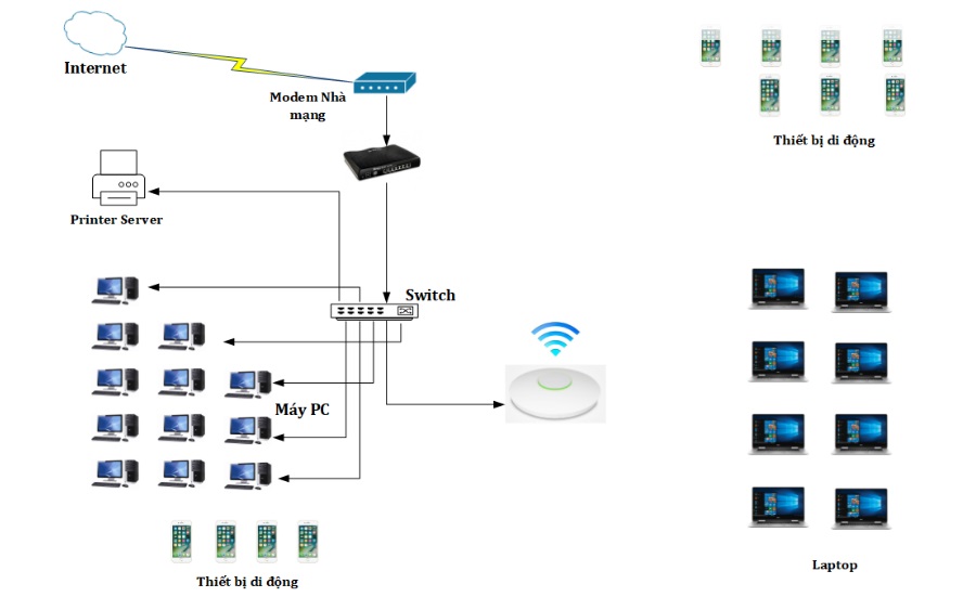Là một hệ thống mạng thông thường nên hệ thống chỉ bao gồm modem nhà mạng và các router wifi thông thường.